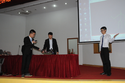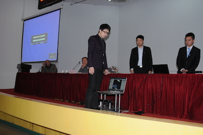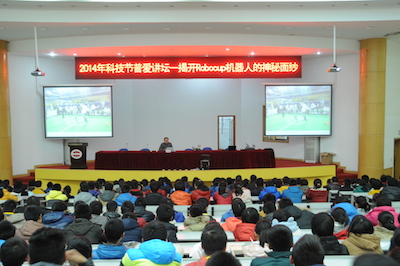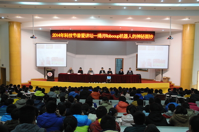 下午两点,伴随着南京邮电大学宣传片的播放,2014年新海高级中学科技节南邮专场拉开帷幕。首先,由丁静书记介绍了我校的人才培养、学科建设等发展近况,并感谢新海高级中学为我校输送的优秀人才,他们进入南邮后,学习勤奋,刻苦钻研,素质发展全面。随后,梁志伟副教授以“揭开RoboCup机器人的神秘面纱”为题,开始了专题讲座,讲座中提到了我校Apollo团队多次获得世界冠军、中国冠军的骄人成绩并为中学生介绍了RoboCup机器人大赛的组别和规则。最后,由基地4名学生为大家演示了机器狗、TurtleBot以及在我校第十六届创新杯中刚刚夺得一等奖的“服务残疾人的Kinect体感遥控机器”。