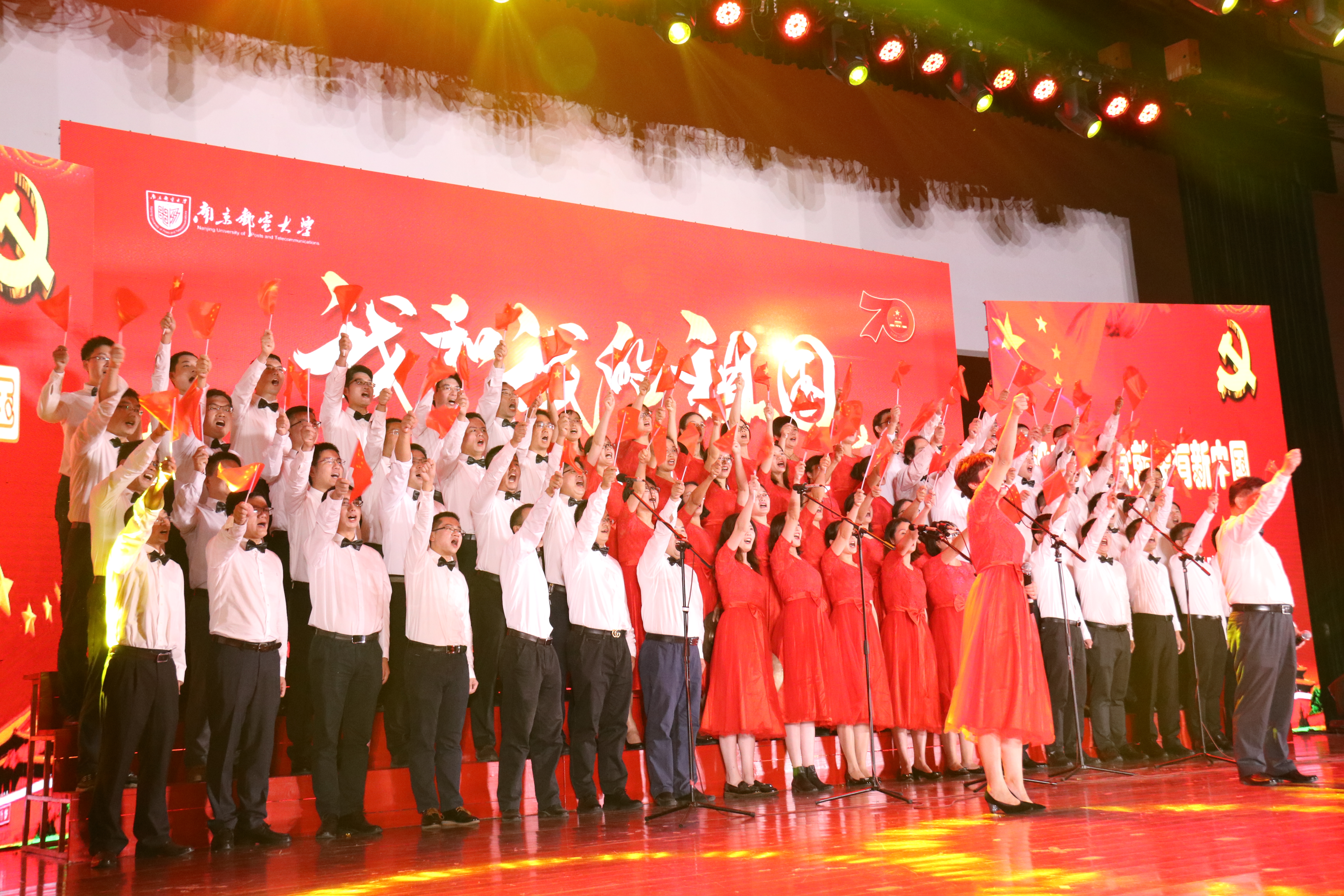 9月28日下午,仙林校区青春剧场,南京邮电大学庆祝中华人民共和国成立70周年文艺汇演暨教职工合唱比在激昂的啦啦操表演中拉开帷幕。