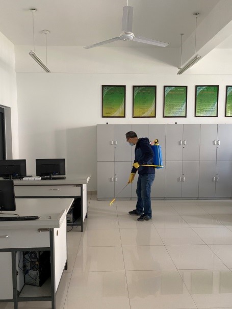 428日上午开始,中心全体老师首先领取了消毒用医用口罩、一次性手套、洗手液、消毒剂等防疫物资,按照学校防疫工作规定,定点放置在各实验室;在切断电源开关、紧闭门窗的情况下,对学院学科楼一楼、二楼全部的教学实验室,使用稀释的84消毒溶液进行整体实验室地面的喷洒消毒工作;同时,对消杀完毕的房间,作用30分钟以上后开窗通风。地面消毒完成后,实验中心老师轮流作业,先用酒精湿巾对仪器设备、桌椅、门窗把手等接触部位进行消毒作业,然后对地面进行卫生清洁,尽最大可能不留死角盲区。