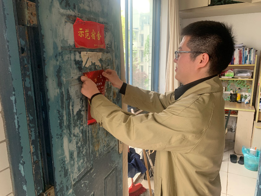 陈迪生副书记和学生党支部书记为学生党员宿舍进行挂牌,随着学生党员的进一步发展壮大,各支部书记为党员宿舍更换了身份标识。陈迪生副书记要求学生党员要时刻谨记党员身份,严格要求自己,从个人卫生保持到宿舍卫生清洁都要做好表率作用,共同营造良好的学习生活环境。