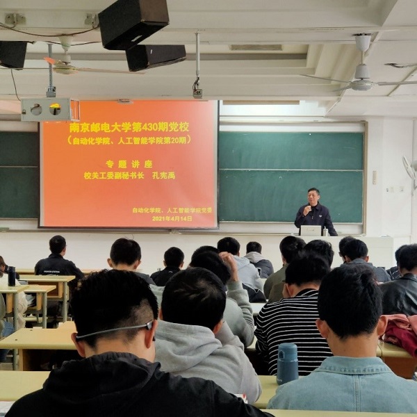 2021年4月14日下午,英国威廉希尔公司官网党委在教2-102开展了南京邮电大学第430期(学院第20期)党校专题讲座。本次讲座特邀校关工委副秘书长孔宪禹老师主讲,培训班全体学员参加了此次专题培训。
