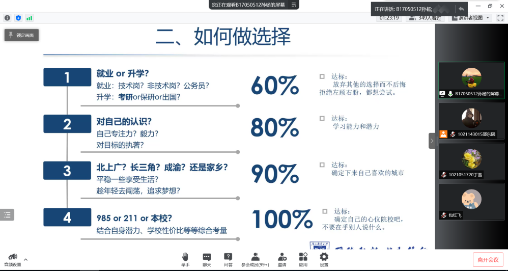 接着,孙杨学长重点从如何做选择、如何上岸两个方面讲解了考研的一些基本概念、获取院校信息的基本方法,由案例强调了信息的重要性、选择大于能力的观点以及从经验帖中有效遴选信息的方法。学长给予了同学们真挚的鼓励,并希望同学们能够树立信心、摆脱迷茫。