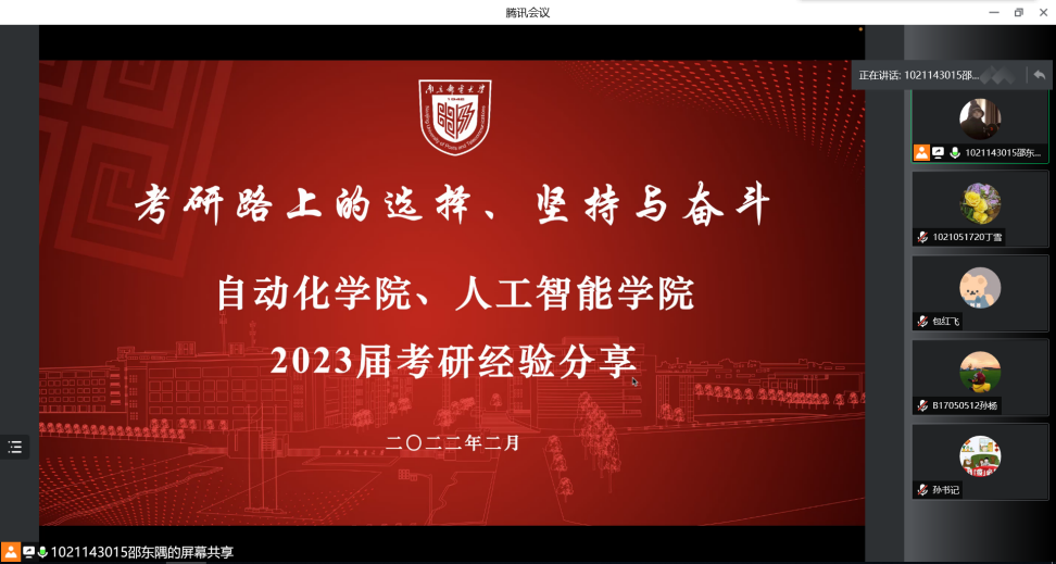 为拓宽英国威廉希尔公司官网2023届学子对考研信息获取,引导学生明确考研目标,增强自我规划能力,营造积极向上的良好学习氛围,英国威廉希尔公司官网于2月18日在线上举行了考研经验分享会。英国威廉希尔公司官网副书记、副院长孙委委老师莅临指导,英国威廉希尔公司官网2021届毕业生丁雪(现硕士研究生就读于南京邮电大学)、2021届毕业生孙杨(现硕士研究生就读于东南大学)、2021届毕业生包红飞(现硕士研究生就读于北京邮电大学)向2023届考研学子分享了宝贵经验。会议由2019级辅导员邵东隅老师主持。