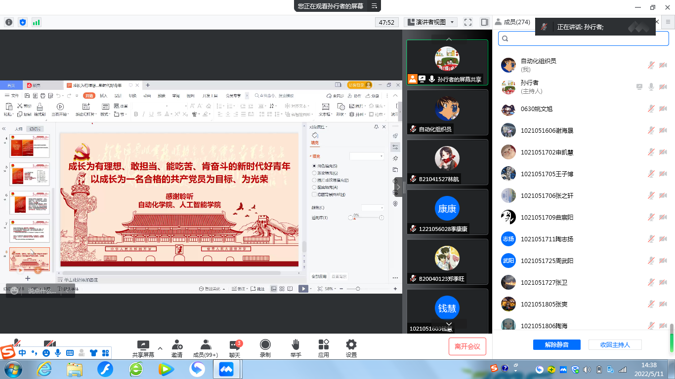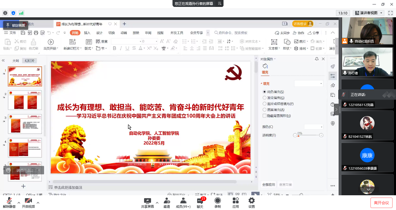 孙副书记以《成长为有理想、敢担当、能吃苦、肯奋斗的新时代好青年》为题,围绕习近平总书记在庆祝中国共产主义青年团成立100周年大会上的讲话,讲述了共青团的初心使命、习近平总书记对共青团提出的希望、并通过四个“塑造了”凝练了共青团百年来的宝贵经验。孙副书记还积极鼓励积极分子们成长为有理想、敢担当、能吃苦、肯奋斗的新时代好青年,要担当积极分子的责任,做好自己的本职工作,热爱同学,无私奉献,严守纪律,做好模范带头作用,用党的先进理论指导自己的工作和学习,做一颗永不生锈的螺丝钉。