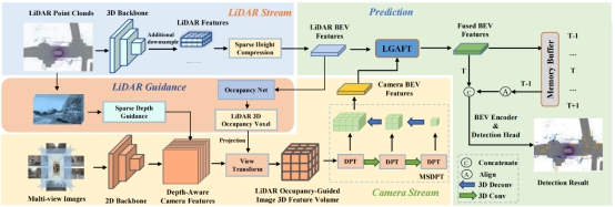 该论文聚焦于多模态3D目标检测,特别是在鸟瞰图(BEV)视角下的应用。他们提出了一种创新的方法,名为GAFusion,它通过稀疏深度引导(SDG)和激光雷达占据引导(LOG)来生成具有丰富深度信息的3D特征,并利用激光雷达引导的自适应融合transformer(LGAFT)从全局角度增强不同模态BEV特征之间的交互。此外,研究团队还设计了一个BEV网格来存放多尺度下采样特征,并开发了多尺度双路径transformer(MSDPT),以扩大不同模态特征的接受域,显著提高了检测性能。GAFusion有助于自动驾驶领域安全性的重大提升,也为多模态3D目标检测领域后续的研究提供更多的见解。